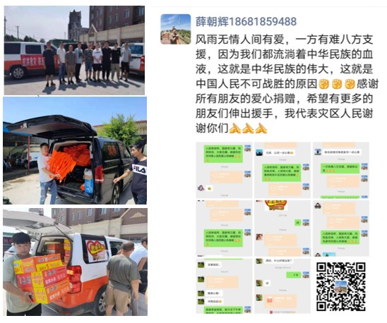 陕西大件人薛朝辉为家乡募捐援驰。在中交协大件专委会的倡导下,身在西安的陕西兴辉大件运输有限公司总经理薛朝辉,听闻家乡新乡遭受暴雨灾害,父老乡亲处于水深火热之中,立即在朋友圈发出“一方有难,八方支援”的倡议,号召大件行业同仁伸出援手,为新乡灾区捐资捐物。已于25日将第一批物资150件救生衣、50件救生绳、50个头灯、100件方便面、110件矿泉水、10包蔬菜、6000元医疗物资送达灾区。募捐活动目前还在继续。满屏的爱心,全是对灾区伸出的支援之手,彰显了大件人民族团结、友爱之情。