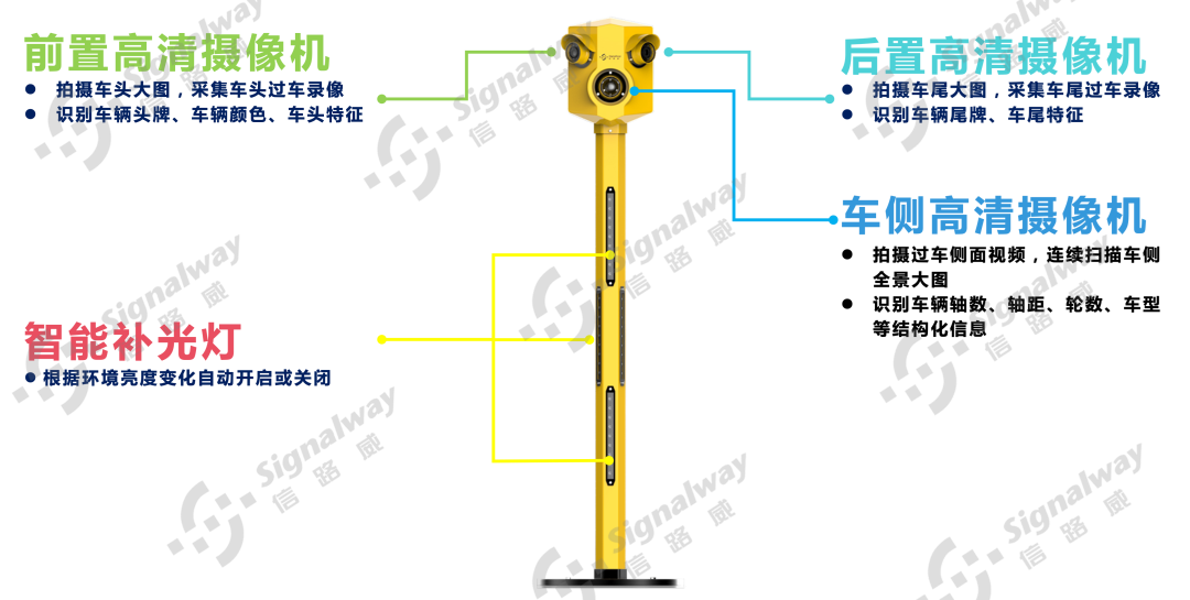 该产品输出的图像数据包含车辆前部、侧面、尾部图片以及视频记录(不小于5s),可清晰辨识车牌号码、车辆轴数/轴型、车辆特征、载货情况等;结合称重设备的数据,可判定车辆是否超限载。