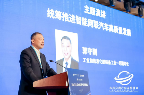 工业和信息化部装备工业一司副司长郭守刚作《统筹推进智能网联汽车高质量发展》主题演讲,图自主办方。